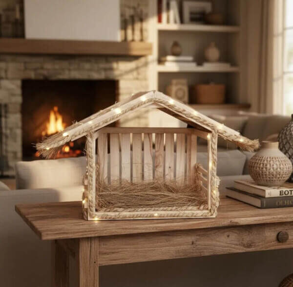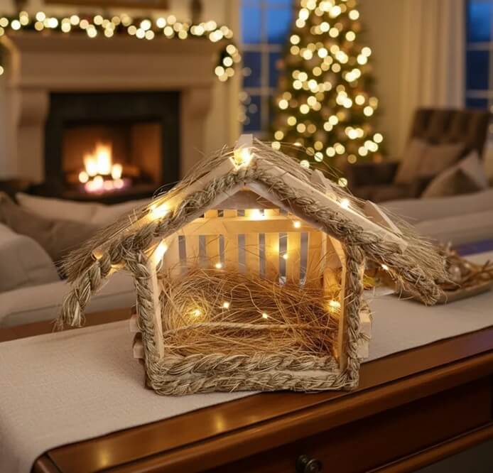Para resaltar la belleza de la madera y la fibra en la noche, te regalamos una luz de hada LED de 2 metros. Al encenderla, el pesebre cobra vida, proyectando sombras cálidas y creando el ambiente de paz que tu hogar necesita esta Navidad.